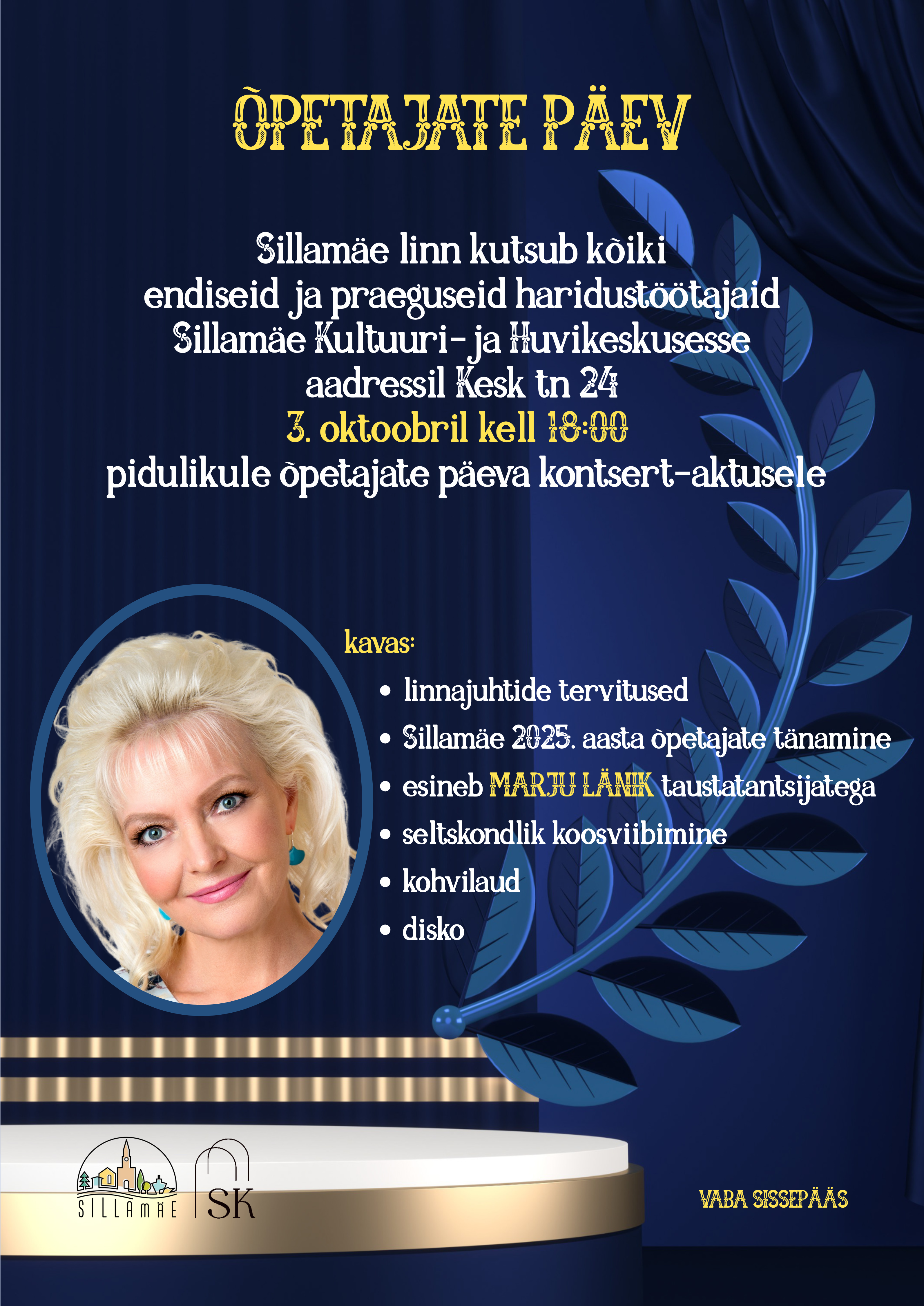 The city of Sillamäe invites all former and current educational workers to the Cultural and Hobby Center at Keski 24 on October 3, at 6:00 pm at the Festive Teacher's Day Concert Concert: