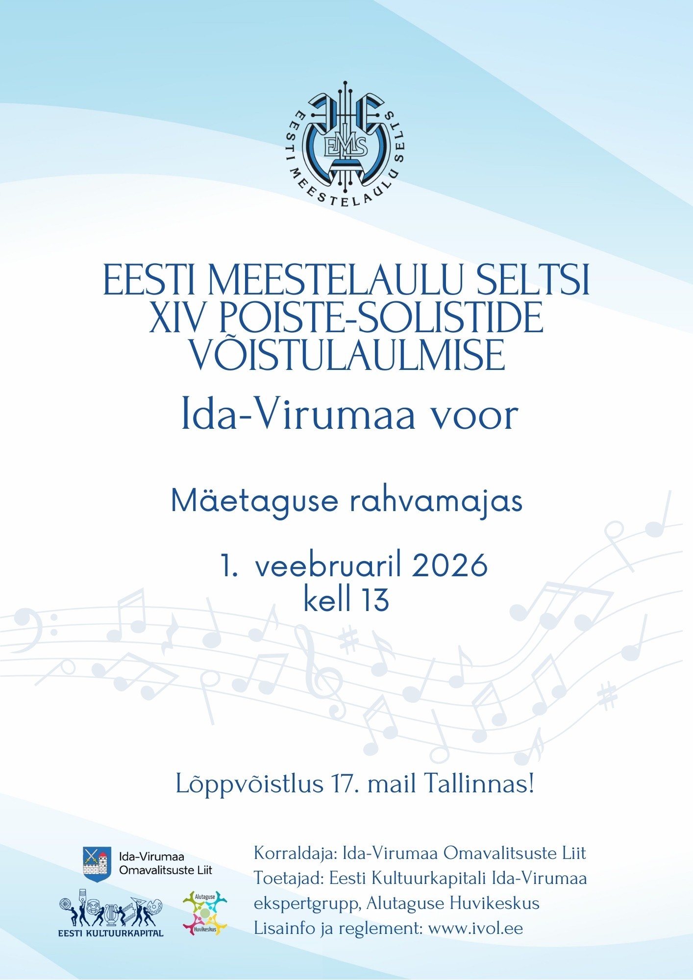 On February 1, 2026, the Ida-Virumaa boys singing competition will take place in Mäetagus community hall. It is a regional event that brings to the stage boys and young men up to 20 years old who are interested in singing from all over the county.