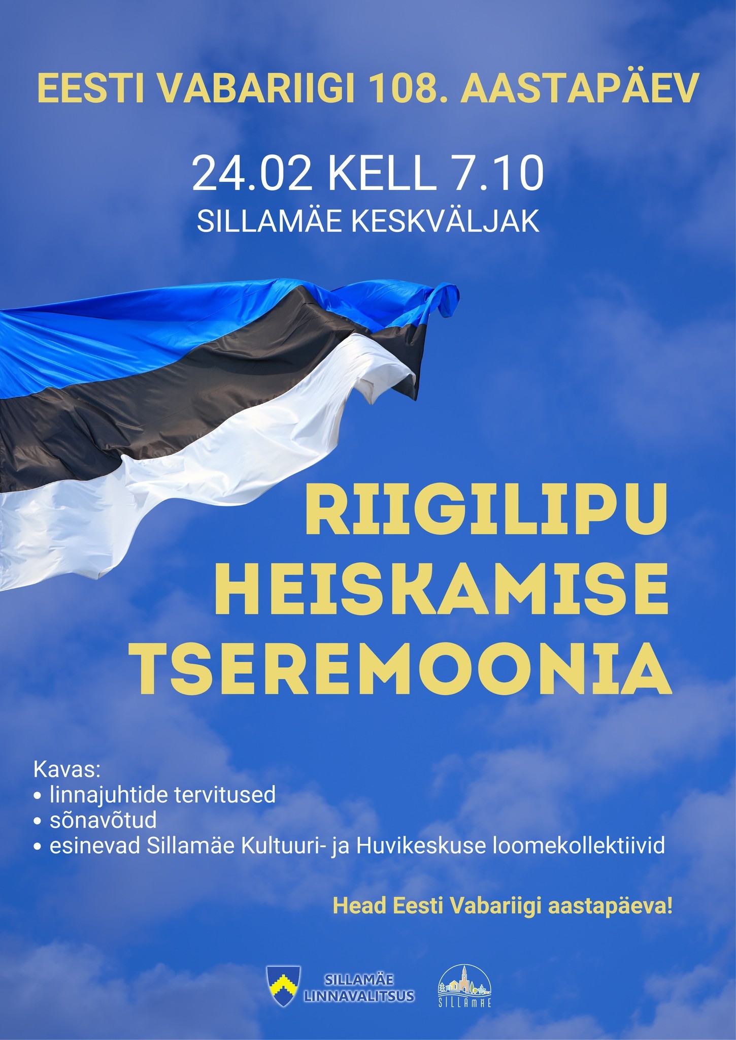 Eesti Vabariigi 108. aastapäev Kavas: -linnajuhtide tervitused -sõnavõtud -esinevad Sillamäe Kultuuri- ja Huvikeskuse loomekollektiivid