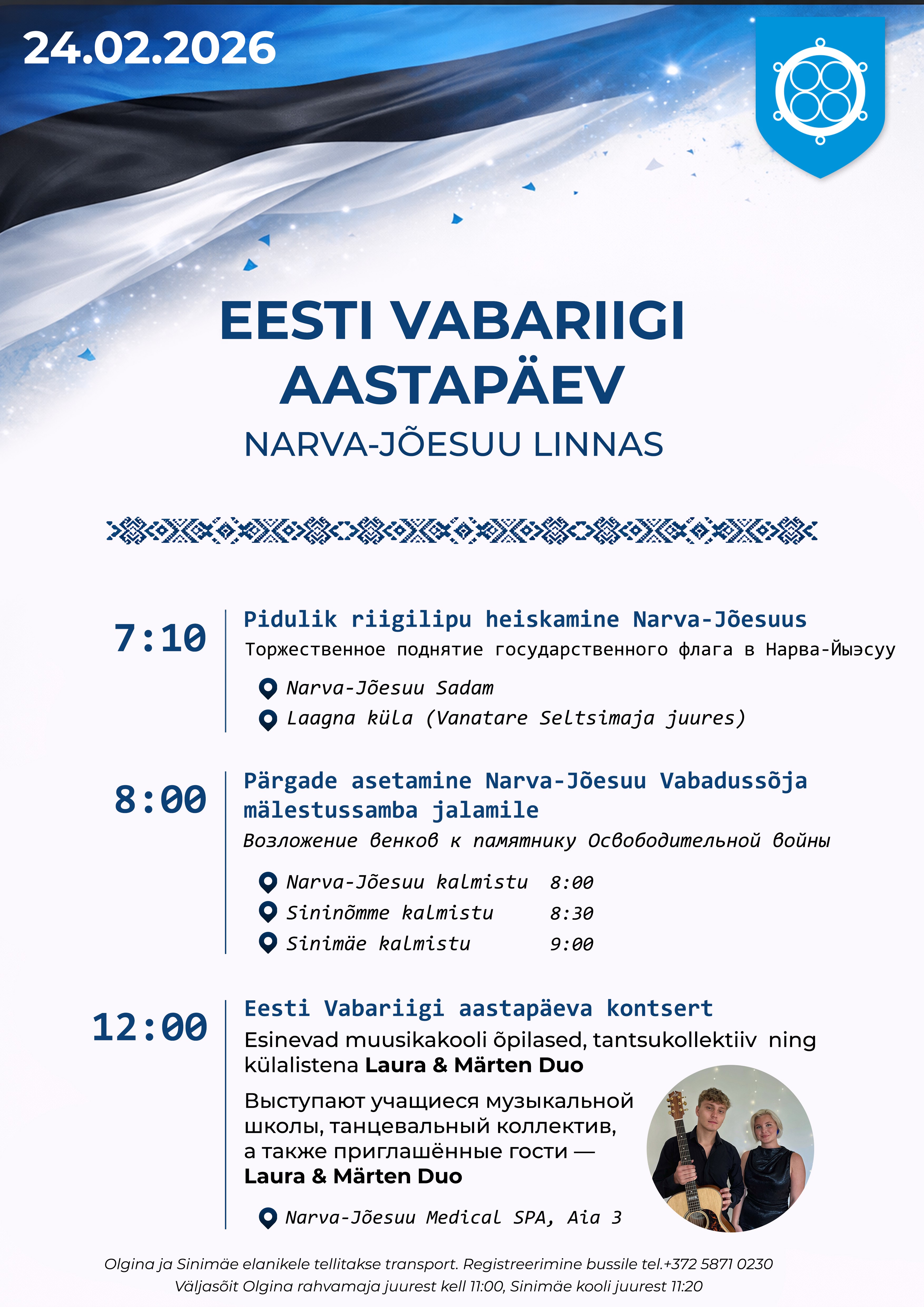 Head Narva-Jõesuu linna elanikud ja külalised! Ootame teid 24. veebruaril Eesti Vabariigi aastapäeva tähistamisele Narva-Jõesuus.