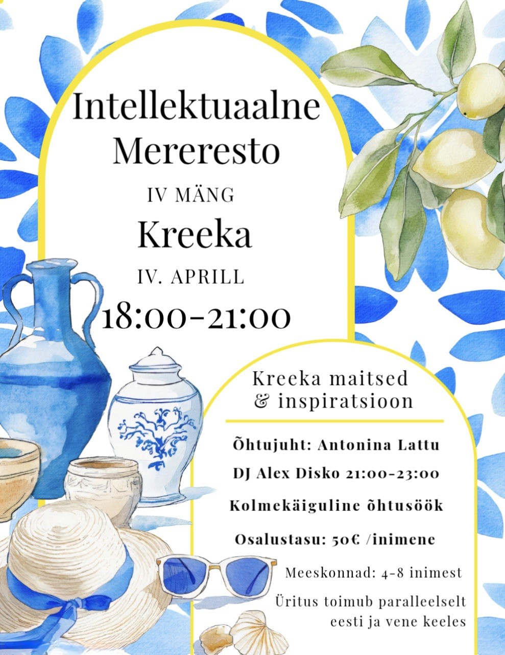 4. aprillil kell 18:00 kutsume teid Intellektuaalse Mereresto 4. mängule, kus gastronoomia avab ukse Kreeka kultuuri sügavustesse. Ülestõusmispühade eel saavad kokku antiikpärand ja ehtsad maitsed.