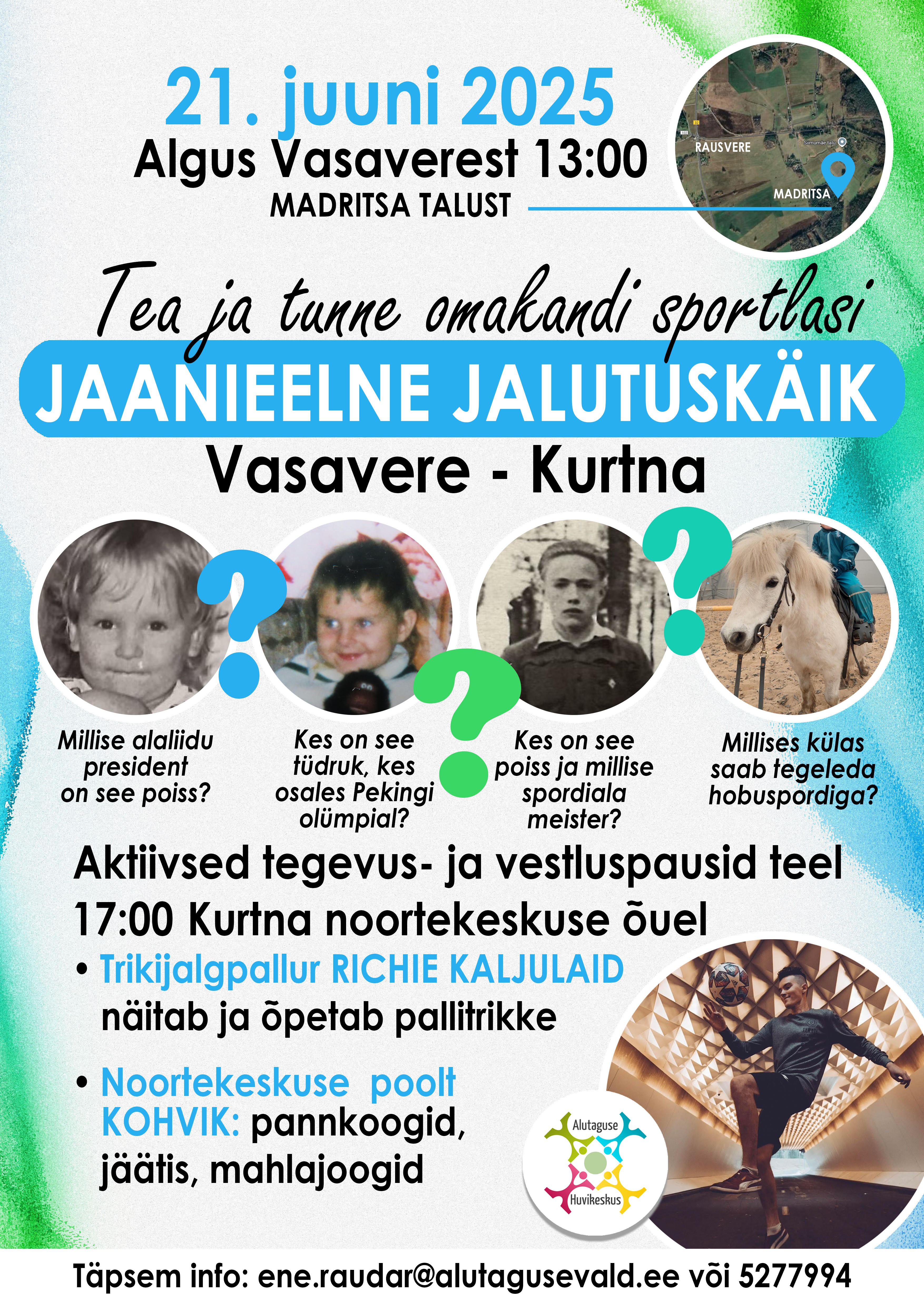Kurtna kogukonnarahvas kutsub huvilisi 21. juunil omakandi (endiste ja praeguste) sportlastega kohtuma ja jalutuskäiguga ise sportlikud olema. Igas peatuspaigas on ka väheke mänge ja mäluharjutusi. Alustame Vasavere külas Madritsa talus kell 13.00 ja lõpetame kl 17.00 Kurtna noortekeskuse õuel, kus tuntud trikijalgpallur Richie Kaljulaid oma oskusi esitleb ning soovijatele ka õpetusi jagab.