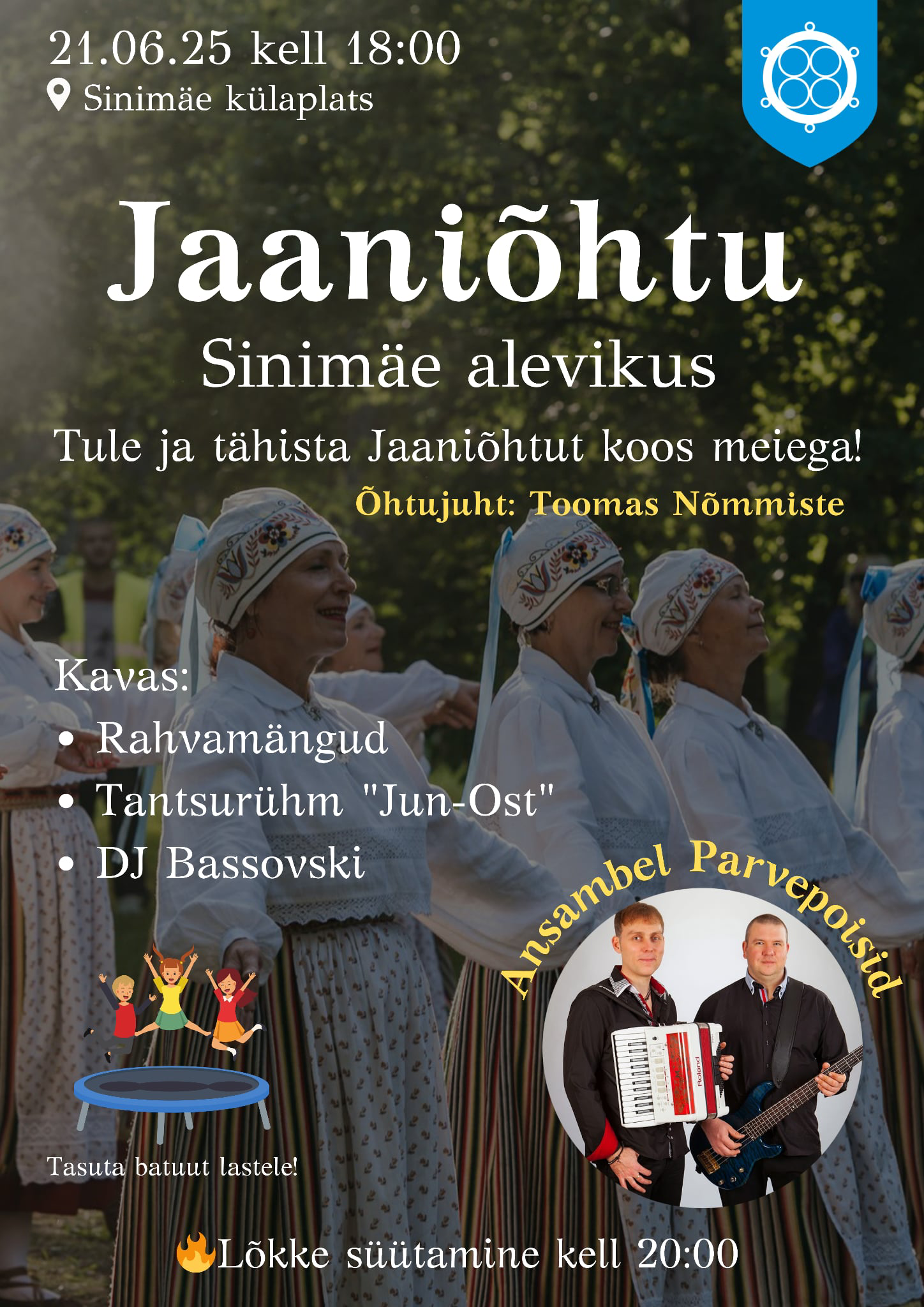 Kutsume teid tähistama suve kõige maagilisemat hetke – jaanipäevaõhtut Sinimäe alevikus! Reedel, 21. juunil kell 18:00 Sinimäe külaplatsil ootab külalisi meeleolukas pidu parimate rahvapidude traditsioonide vaimus: lõbusad mängud ja konkursid kogu perele, särav etteaste tantsurühmalt "Jun-Ost", ansambli Parvepoisid kontsert ning disko DJ Bassovski saatel.