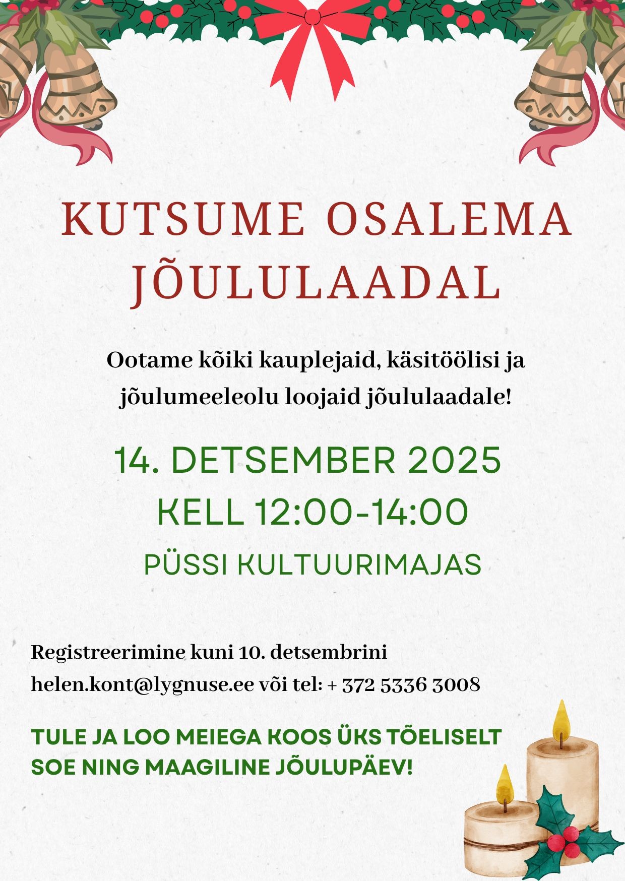 Ootame kõiki kauplejaid, käsitöölisi ja jõulumeeleolu loojaid jõululaadale!