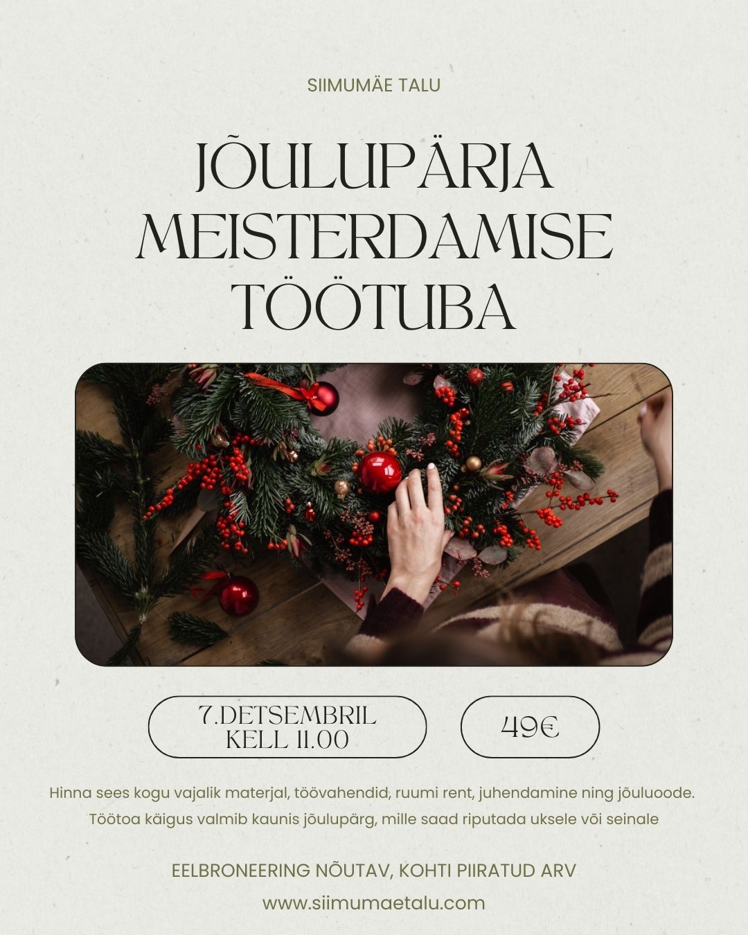 Hinna sees materjal, töövahendid ning jõuluoode. Vajalik eelregistreerimine: www.siimumaetalu.com