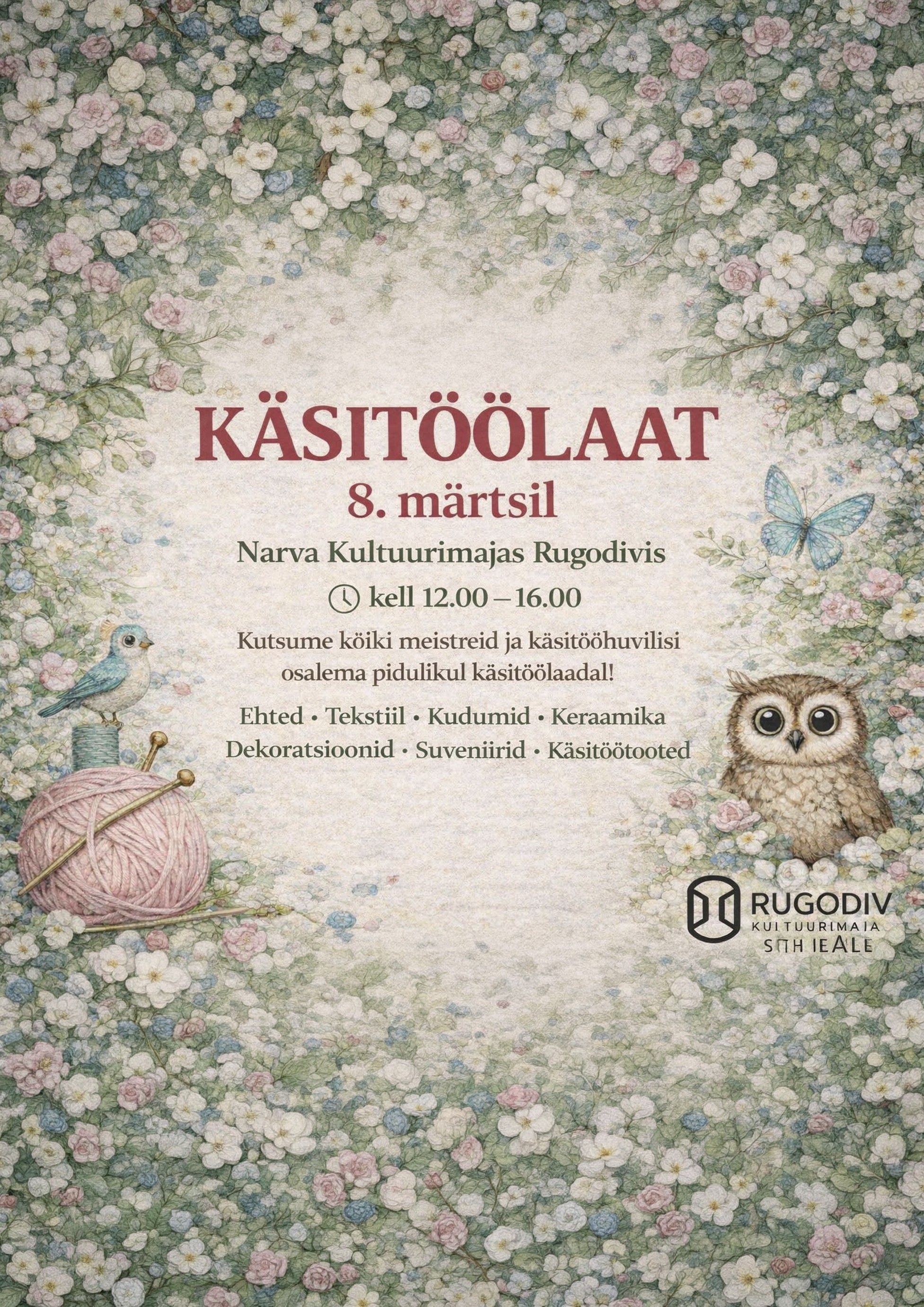 Narva Kultuurimaja Rugodiv kutsub Teid osalema käsitöölaadal, mis toimub 8. märtsil kell 12.00–16.00.