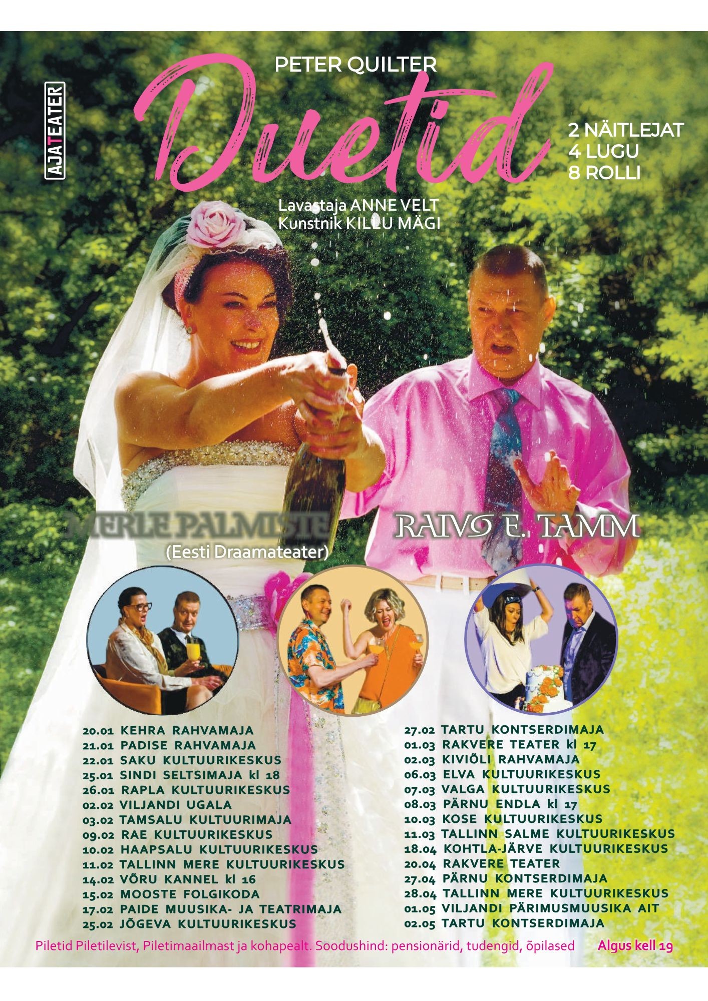„Duetid“ on tempokas näitemäng, kus neli erinevat paari tegutsevad tihti koomilistes ja vürtsikates olukordades. Näitlejad Merle Palmiste ja Raivo E. Tamm astuvad üles neljas lühiloos: Pimekohting, Sekretär, Lahutus ja Pulmad. Näeme ootusärevaid kohtinguid, vastamata ja vastatud tundeid, särtsakaid lahkuminekuid ning ka pulmapidu, mille eel juba kolmandat korda abielluv pruut keeldub uksest välja astumast. Lavastus pakub äratundmist, naeru ja alati lootust, et parim on veel ees.