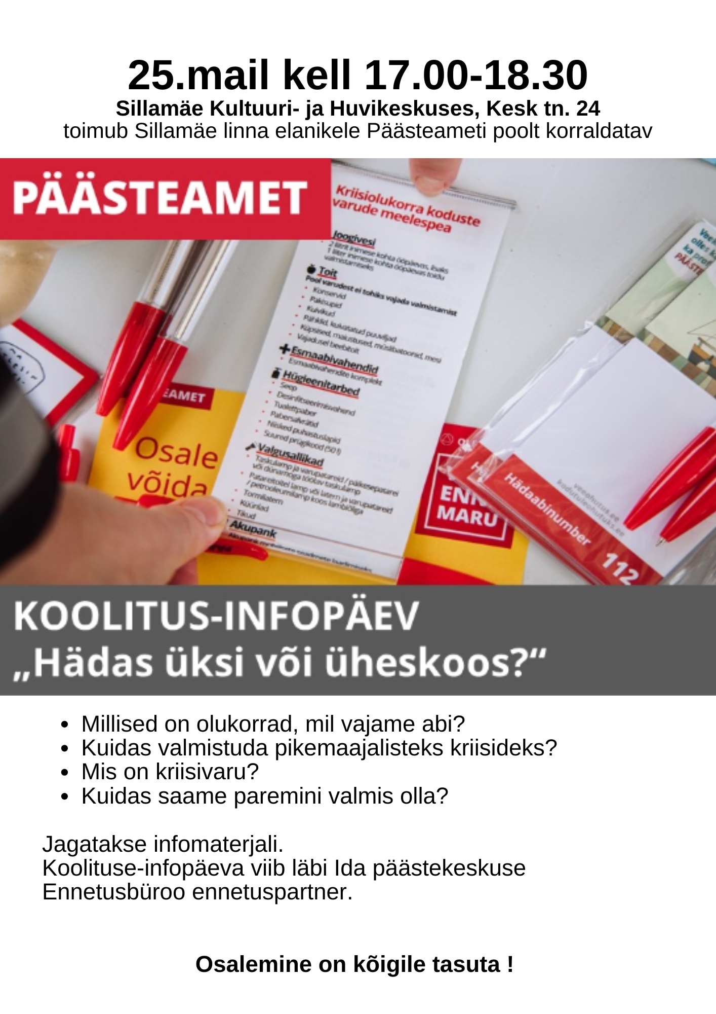 Jagatakse infomaterjali.Koolituse-infopäeva viib läbi Ida päästekeskuse Ennetusbüroo ennetuspartner.