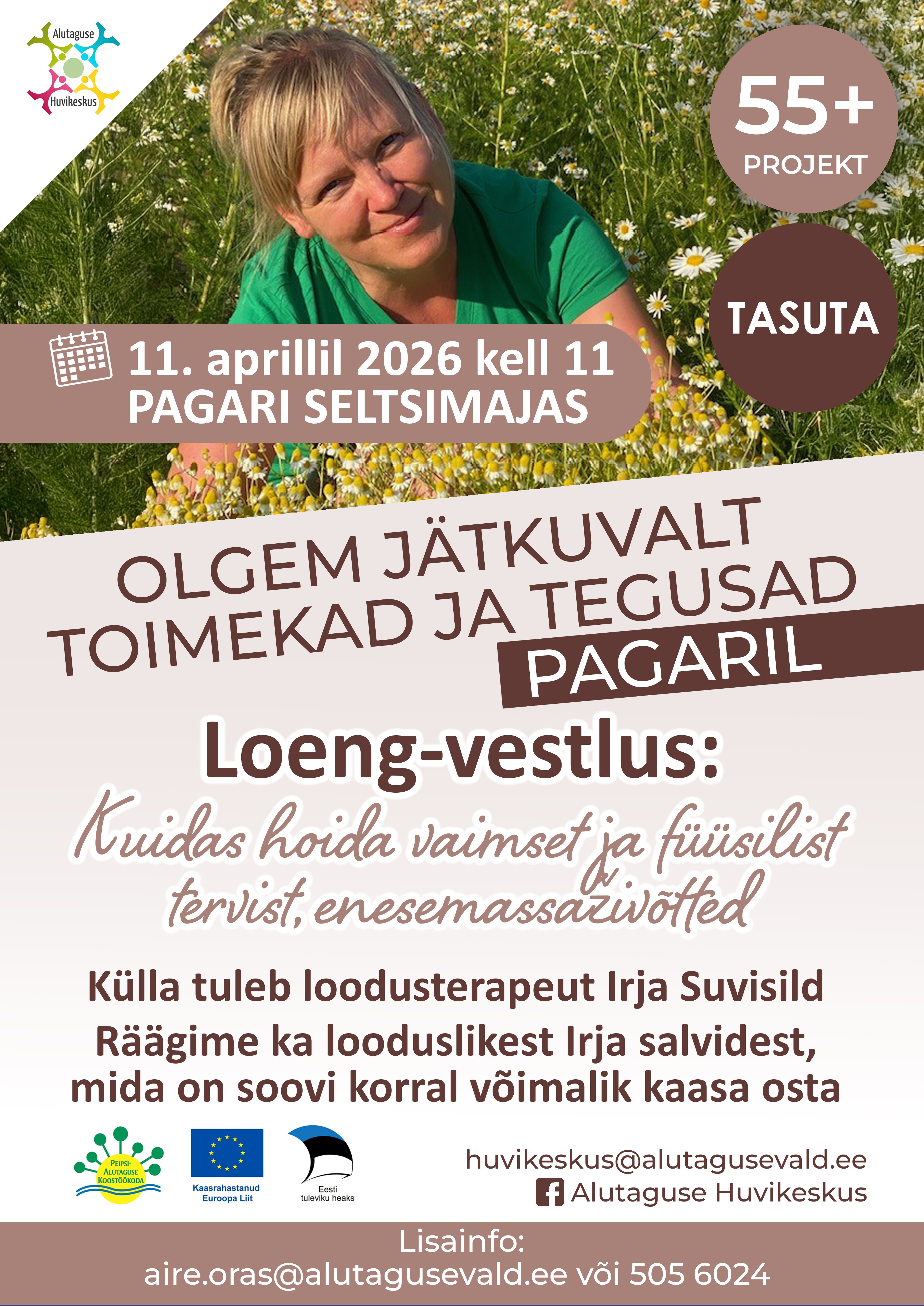Projekt 55+ "Olgem jätkuvalt toimekad ja tegusad Pagaril. Loodusterapeut Irja Suvisild on tuntud kaubamärk kellel on eestimaisest toorainest ravikreemide sari. Juttu tuleb ravitaimedest, kuidas ja millal neid õigesti korjata ja kuidas nendest saab imelisi salve teha. Räägime ka tervise hoidmisest, meelelaadist ja meelerahust.