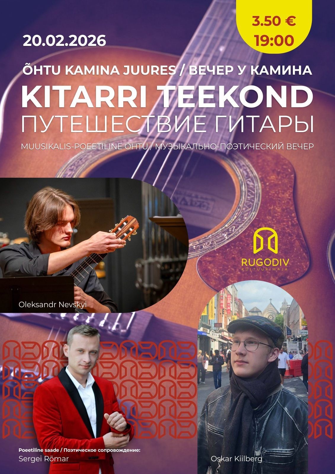 Kammersaali hubases atmosfääris kõlavad kitarripalad ja poeetilised read, mis põimuvad ühtseks kunstiliseks rännakuks. See õhtu on suurepärane võimalus eemalduda igapäevasest saginast ja nautida kitarri elavat kõla.