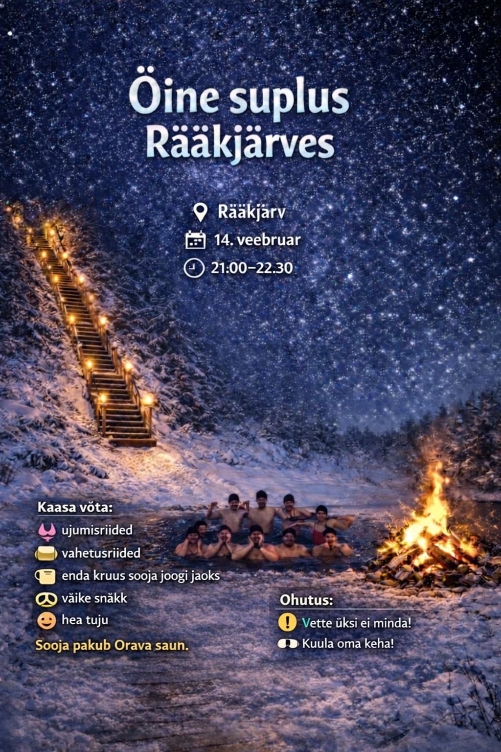 Valgustatud rada juhatab veekoguni. Enne vette minekut võtame hetke vaikuseks, seejärel talisuplus täielikus rahus. Pärast koguneme lõkke äärde, soojendame end ja oleme lihtsalt koos. See ei ole võistlus, vaid elamus – rahulik ja emotsionaalselt meeldejääv. Oodatud on nii kogenud talisuplejad kui ka need, kes tahavad esimest korda proovida. Sooja pakub Orava saun.