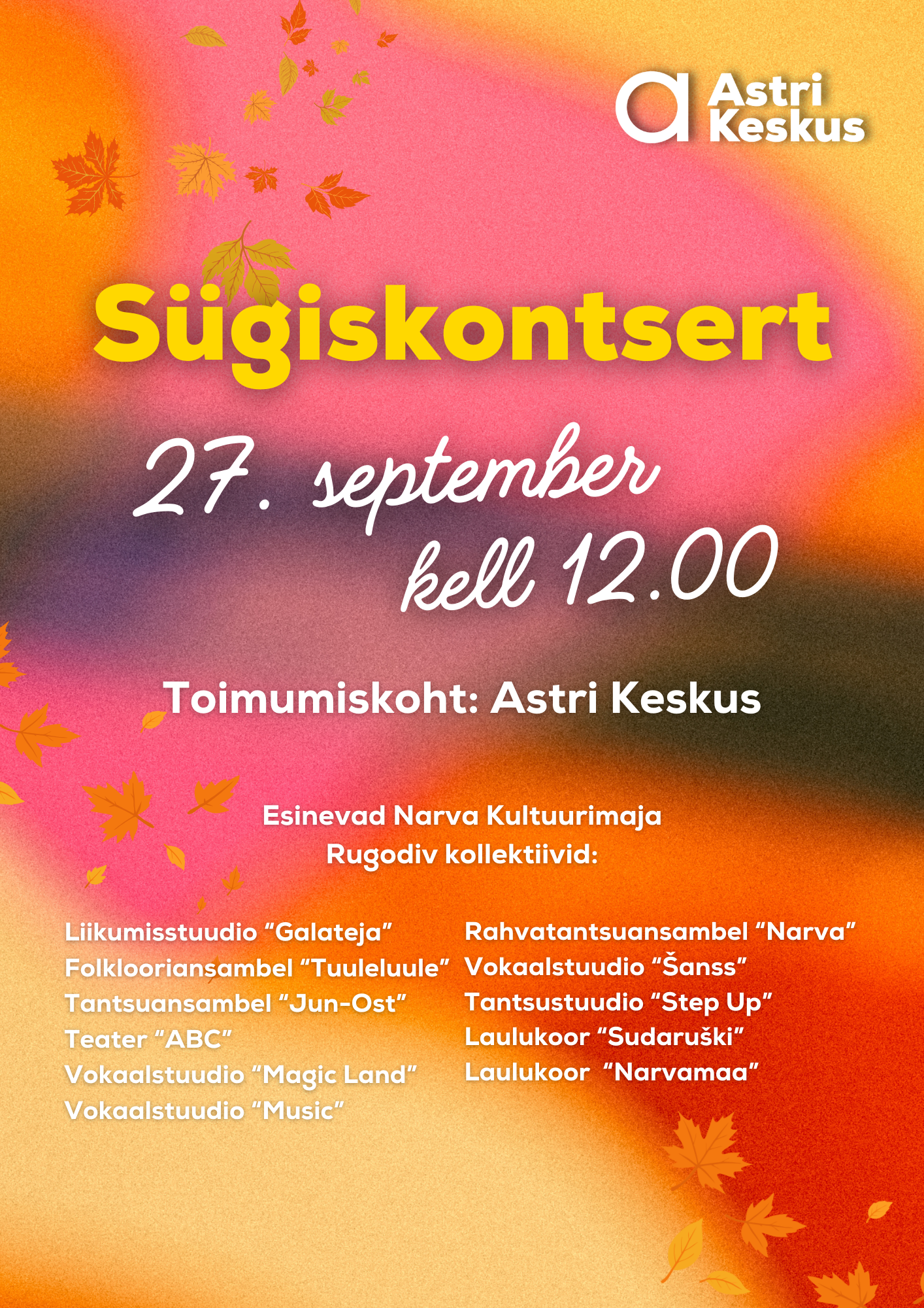 27. septembril kell 12.00 ootame kõiki Astri Keskusesse nautima Rugodivi kultuurimaja sügiskontserti. Laval astuvad üles erinevad ansamblid ja kollektiivid, tuues publikuni mitmekülgse ja värvika kavaprogrammi.