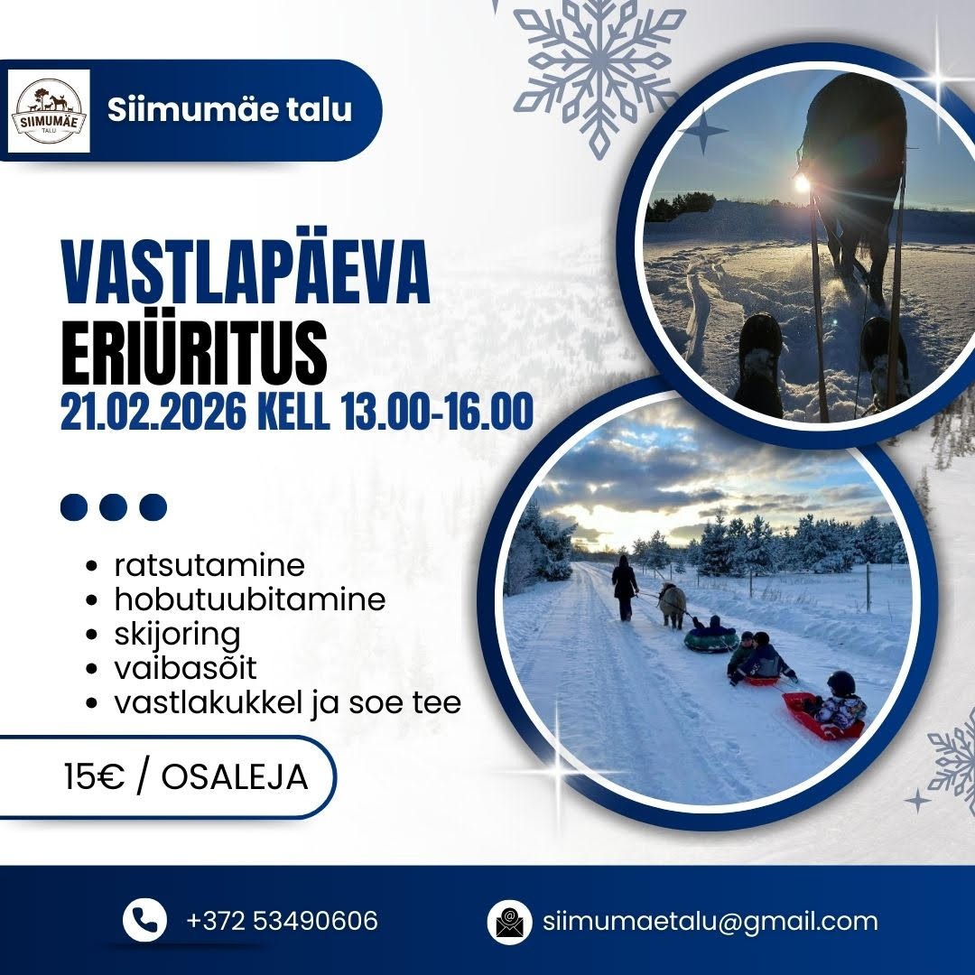 Tule 21.02 meile lustima ja talve nautima! Vastlatrallil saad teha tutvust hobutuubitamise ja skijoringuga. Lisaks pakume lumist vaibasõitu ning kodust vastlakuklit sooja teega.
