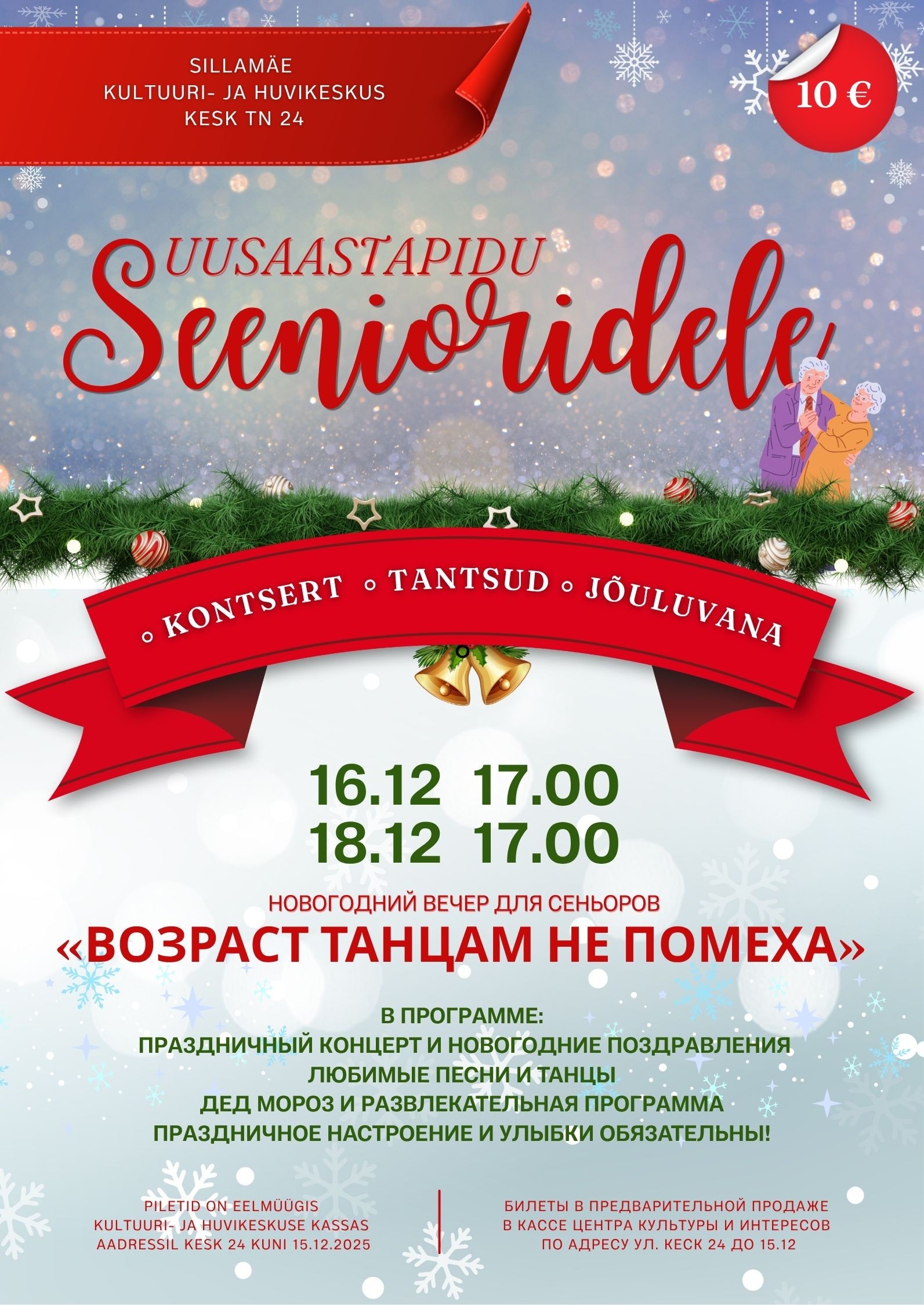 Sillamäe Kultuuri- ja Huvikeskus kutsub kõiki huvilisi aasta lõpu peole, mis on eriti mõnusalt kujundatud seenioridele. Õhtu pakub pidulikku kontserti, armastatud laule, tantsu ning sooja ja sõbralikku seltskondlikku meeleolu. Peole saabub ka jõuluvana, tuues kaasa talvist rõõmu ja häid soove.