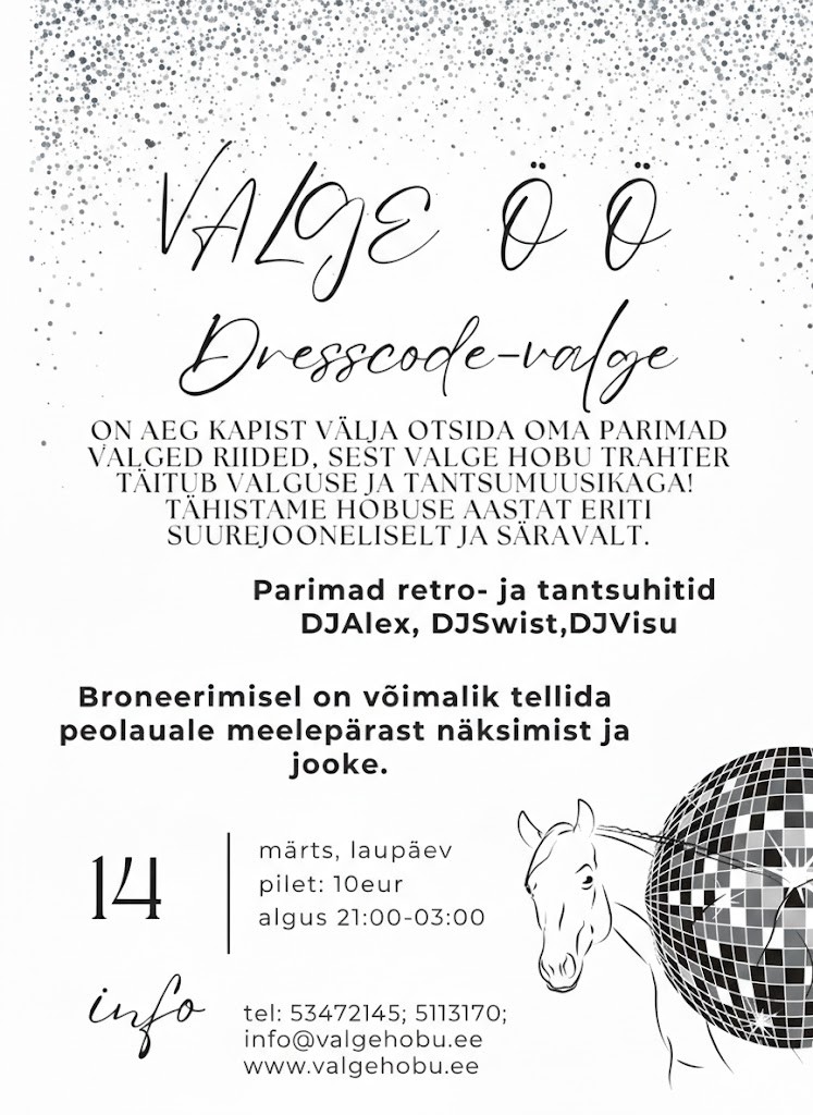 On aeg kapist välja otsida oma parimad valged riided, sest Valge Hobu Trahter täitub valguse ja tantsumuusikaga! Tähistame hobuse aastat eriti suurejooneliselt.