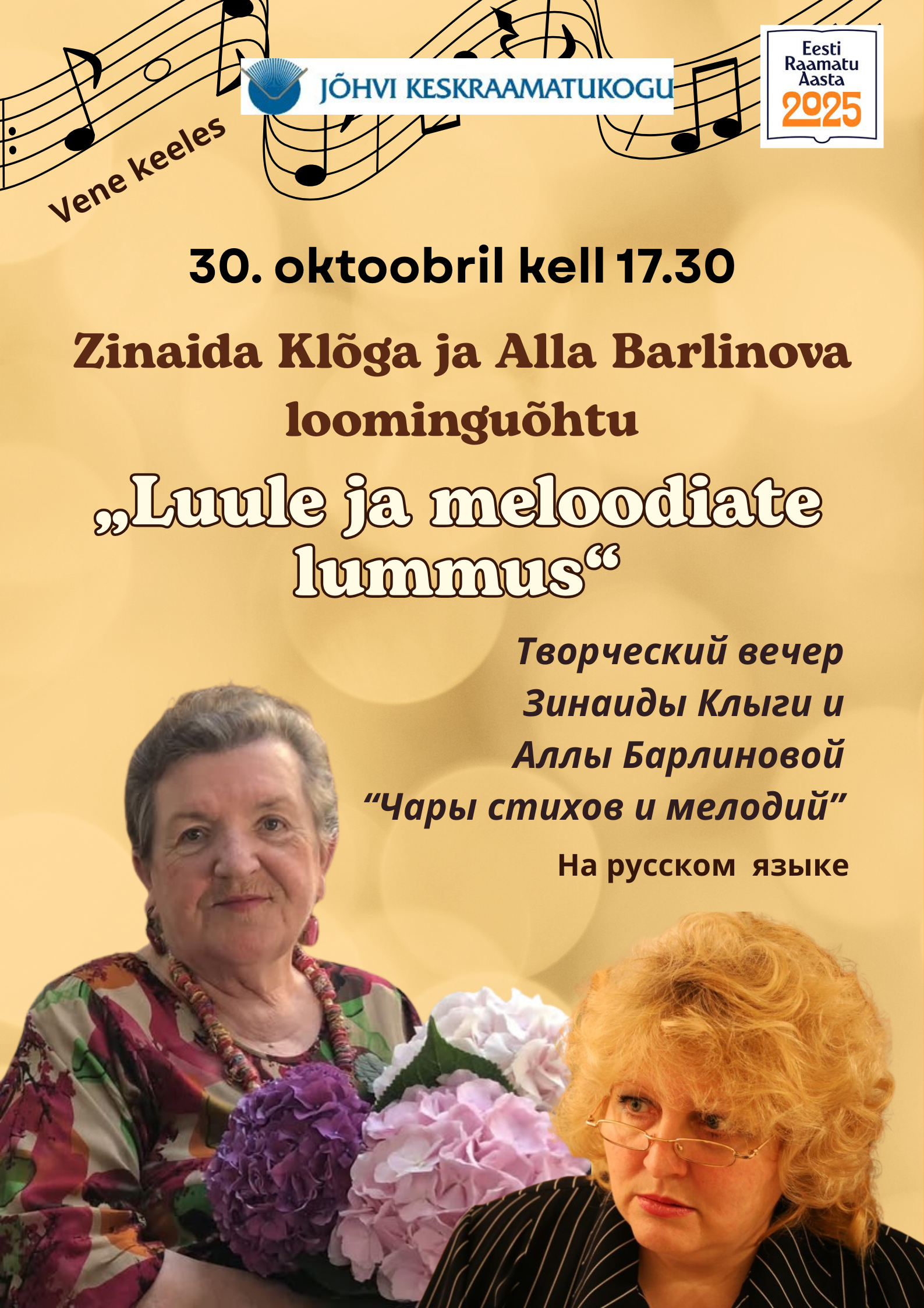 Raamatukogupäevad lõpetatakse Jõhvi raamatukogus neljapäeval, 30. oktoobril kell 17.30 toimuva Zinaida Klõga ja Alla Barlinova südamliku loominguõhtuga „Luule ja meloodiate lummus“, kus Klõga laulab publiku poolt armastatud romansse ning Barlinova esitab oma luulet.