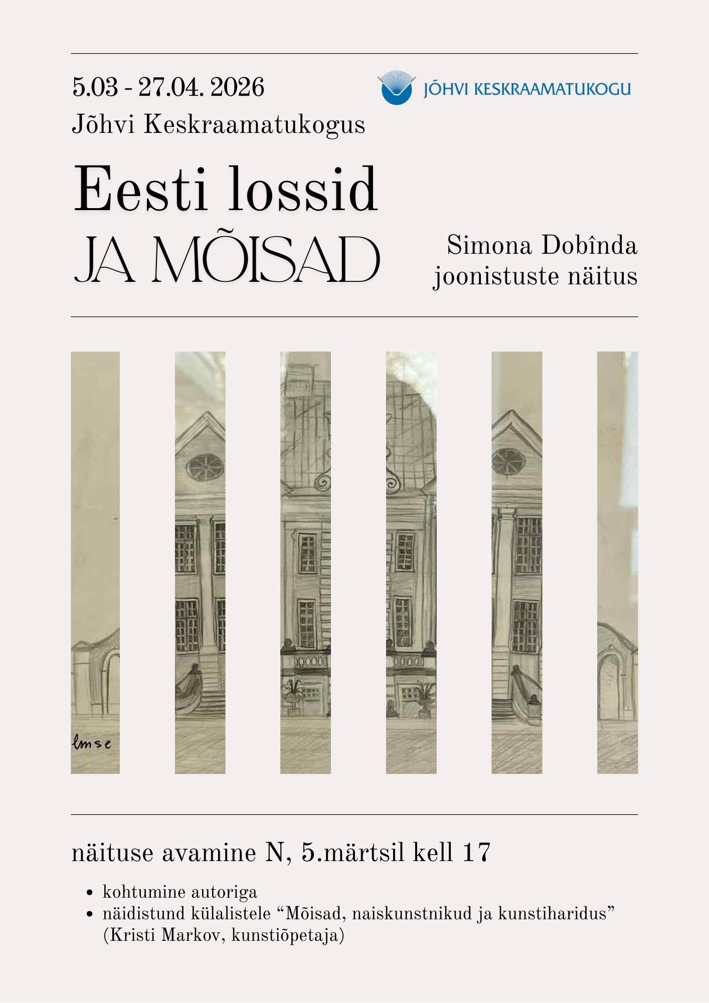 В библиотеке откроется выставка рисунков ученицы 8‑го класса Кивиылиской школы Симоны Добинда под названием „Замки и мызы“. Её учитель Кристи Марков проведёт тематический урок искусства на тему „Мызы, женщины‑художницы и художественное образование“.