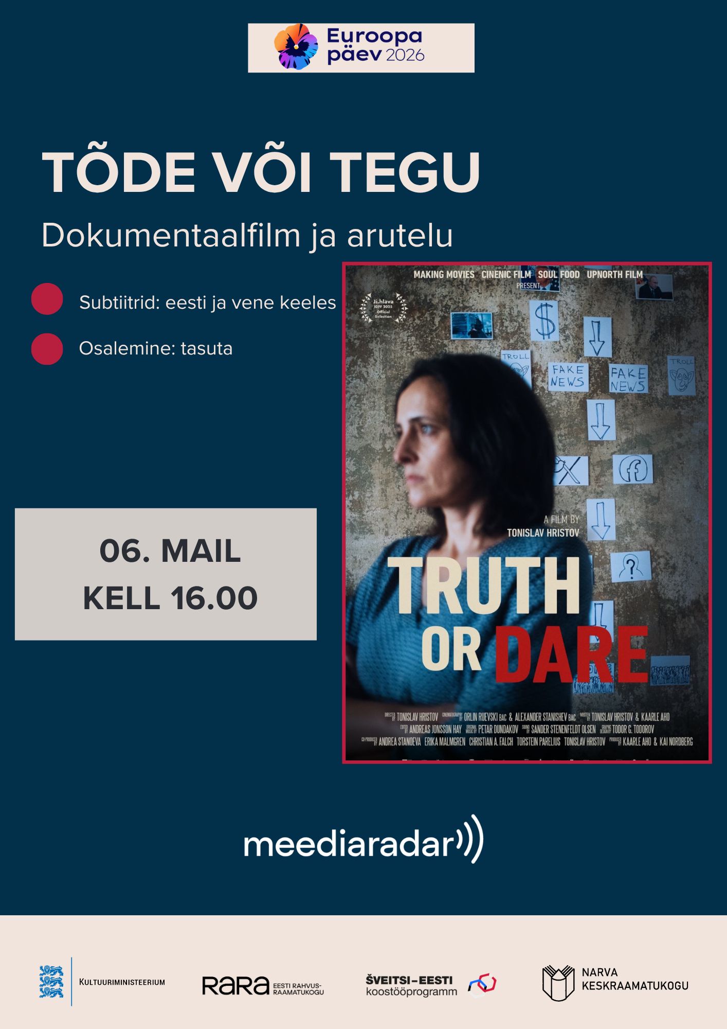 Мероприятие проводится при поддержке проекта MeediaRadar программы швейцарско-эстонского сотрудничества, который пройдет в 2024-2028 годах в сотрудничестве с RaRa и Министерством культуры. Проект софинансируется швейцарским государством с целью сокращения экономических и социальных различий в Европейском Союзе.